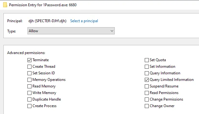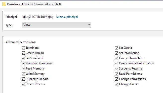 1Password is launched in the same desktop session as the user though, and the user starts the process, so the user is the owner of that process. As a result, I could obtain a process handle with WRITE_DAC and QUERY_EXTENDED_INFORMATION on the process, and using those rights I could adjust the Discretionary Access Control List (DACL) of the process to receive a handle with PROCESS_ALL_ACCESS. Once the new DACL is set, I can get a new handle to 1Password with PROCESS_ALL_ACCESS, and successfully inject shellcode.