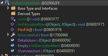 ImDecryptedItem is a simple structure with two attributes, and those two attributes are the only ones we care about. So the initial thought was “let’s walk the heap for ImDecryptedItem objects and use reflection to load the byte arrays.” I’ll attach myself as a debugger, get those credential objects, and write a blog post. Nice and easy.