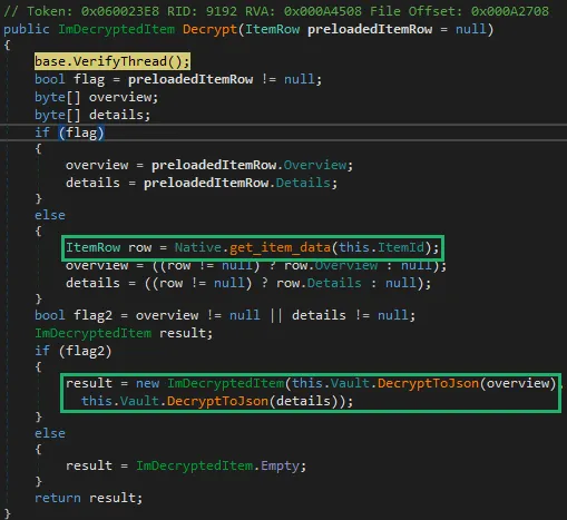 This keys us into another interesting function export from 1Password.dll — get_item_data. This function is responsible for retrieving an item from the 1Password SQLite database where all the user’s secrets are stored. This function call returns metadata surrounding the entry, such as various identifiers, last updated date, if it’s a favorite or if it’s archived, etc. Most importantly, it retrieves two byte arrays named “Overview” and “Details.” Before decryption, each byte array contains data surrounding how that data was encrypted, such as the algorithm, the initialization vector, and more. This data is then passed to the 1Password.decrypt_with_vault_key function where the data within is decrypted and returned to the caller.