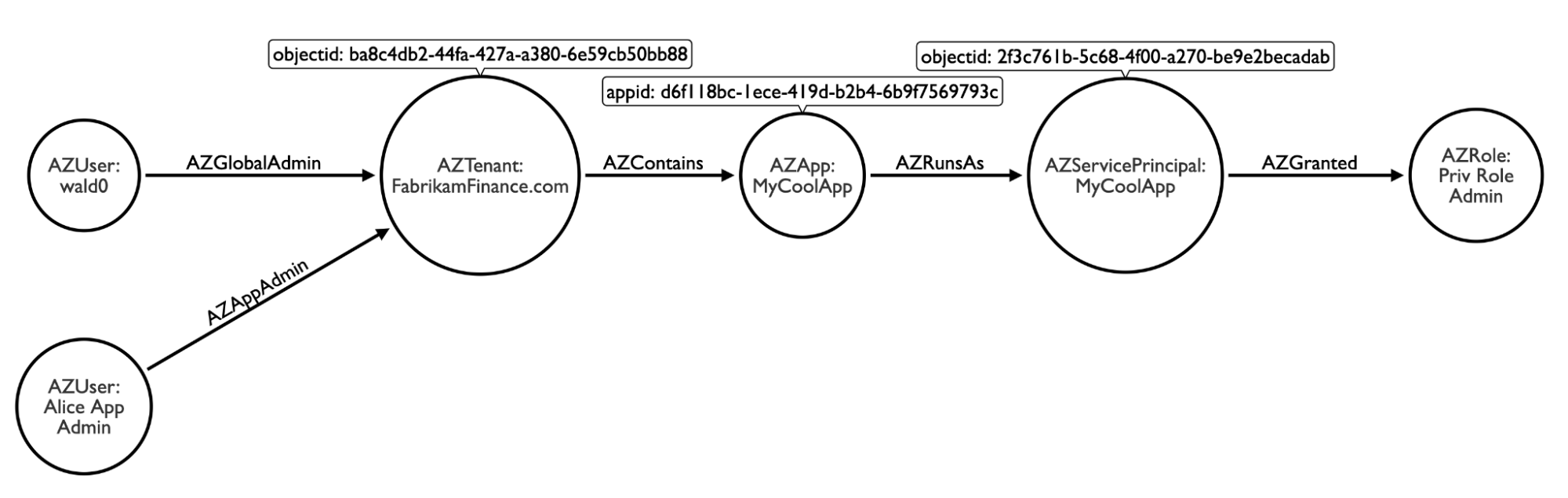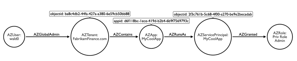 Nothing scary here: my user is a global admin against the tenant, the tenant contains the app, therefore the “path” here is that I have control of the app. Now let’s extend this model to include service principals.