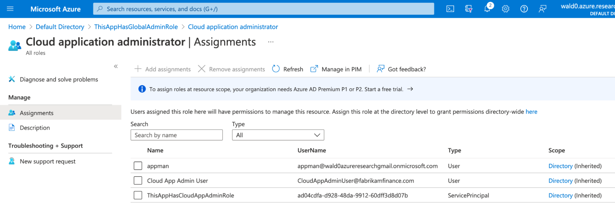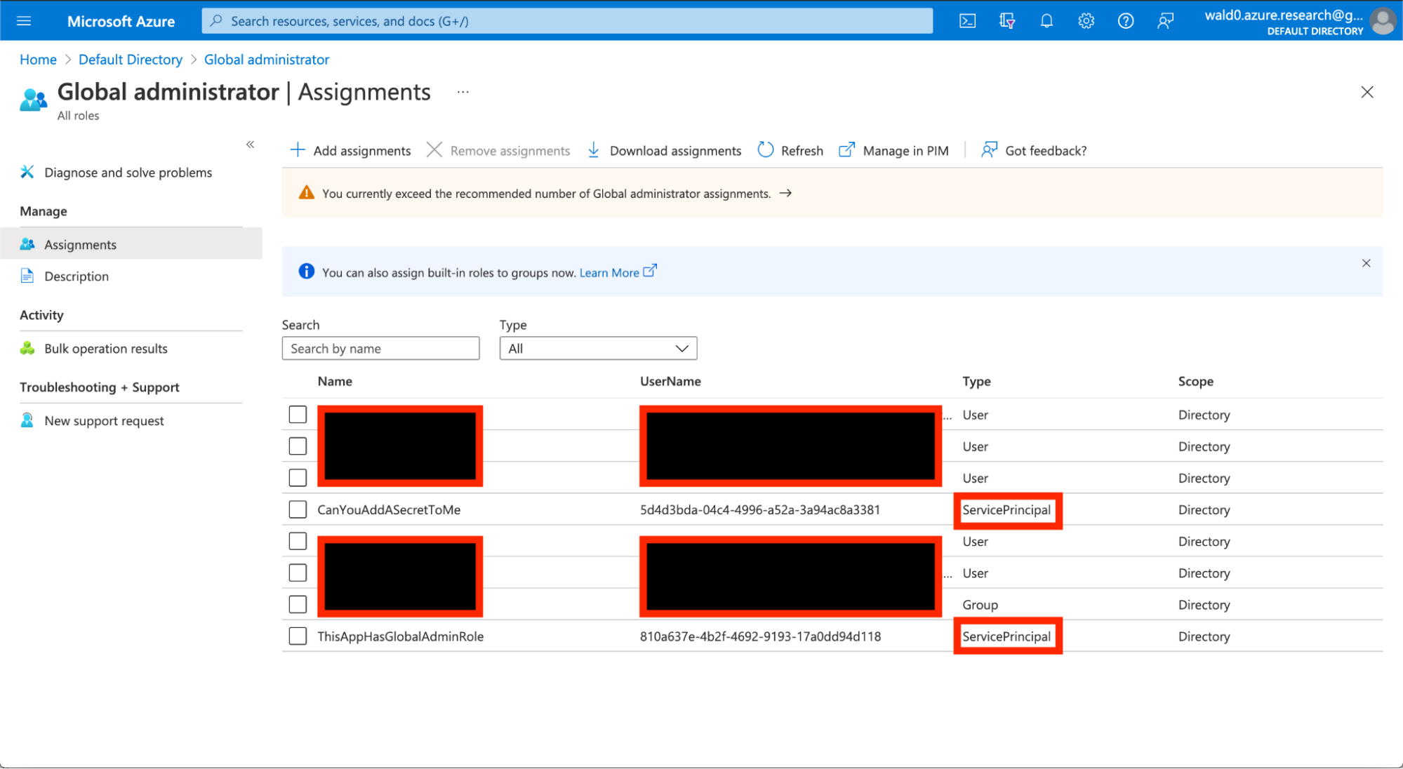 Scroll down to and click on “Global Administrator”. Here, you will see the list of identities with this role currently activated. In the “type” column, look for “ServicePrincipal” entries:
