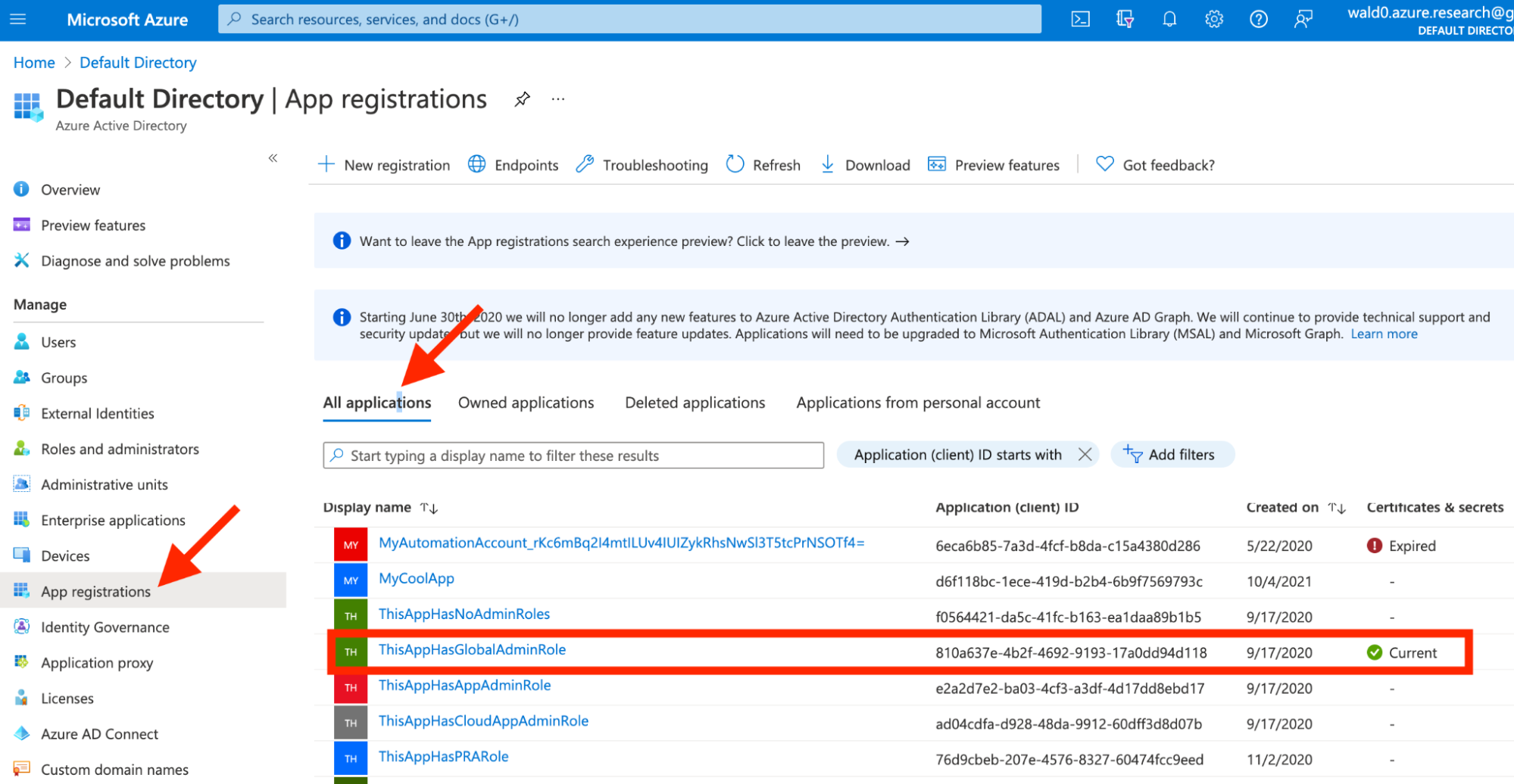 We also need to check the app-level roles and per-app owners. Earlier we saw that the service principal, “ThisAppHasGlobalAdminRole”, was currently a Global Admin. Navigate to your tenant, click on “App registrations”, click on “All Applications”, then find the app associated with that Service Principal: