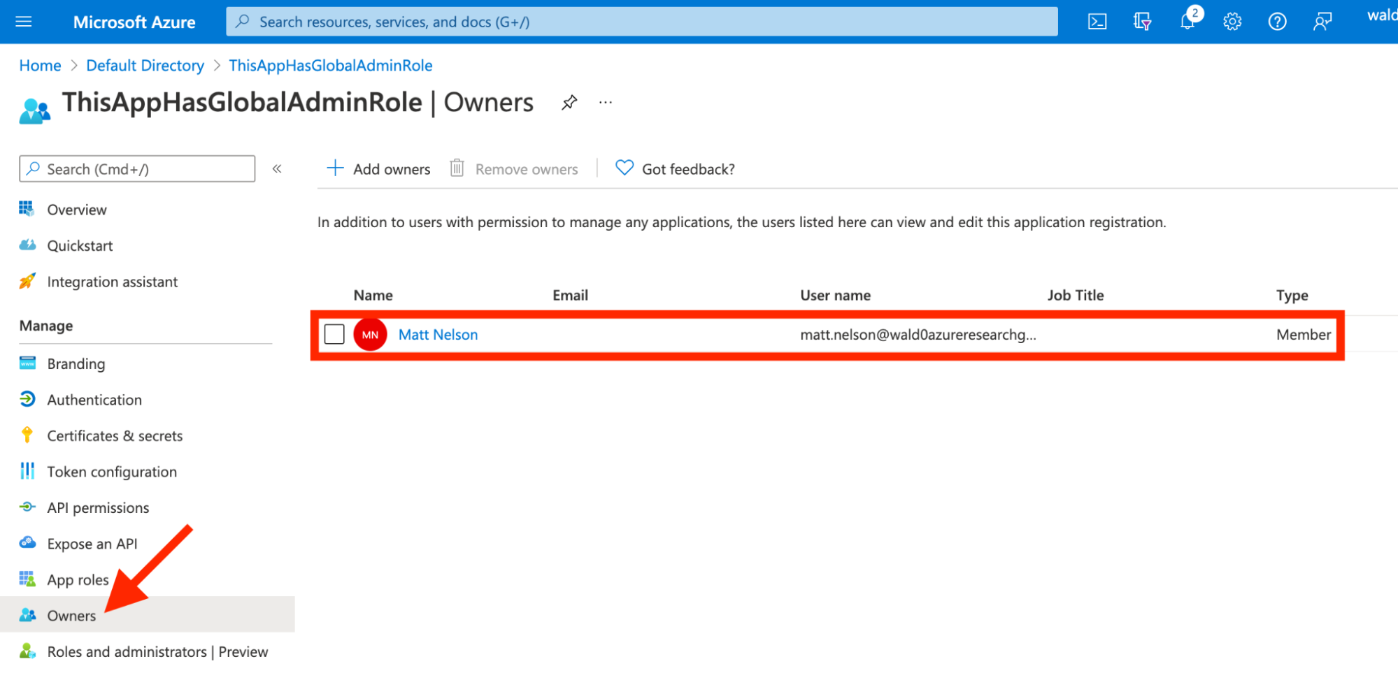 First, click on “Owners”, which will show you all principals that own the app (there can be more than one):