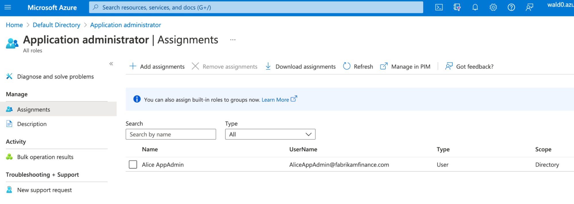 Let’s audit the “Application Administrator” role by navigating to our tenant, clicking “Roles and Administrators”, then click on the Application Administrator role: