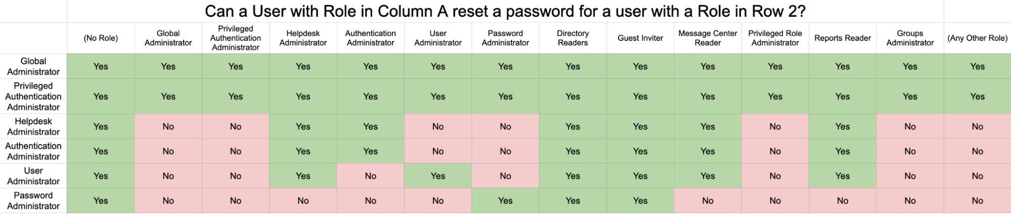 This, to me, is confusing. So I set out to understand all the different possibilities for password reset privileges in Azure, and wound up creating this table: