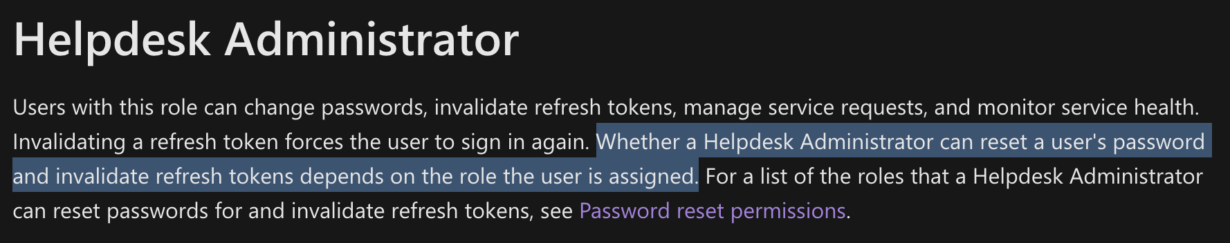 In particular, note the highlighted text: “Whether a Helpdesk Administrator can reset a user’s password and invalidate refresh tokens depends on the role the user is assigned.”