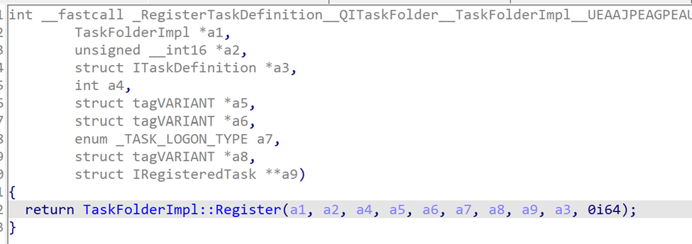 This function simply seems to be a wrapper that ends up calling TaskFolderImp::Register. After analyzing this function, there are some calls into some interesting functions like TaskFolderImpl::GetNewTaskPath and TaskDefinitionImpl::get_RawXmlText, but what really stands out is a call to UniSession::RegisterTask: