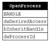 We can then begin by using GraphViz to model the OpenProcess function where the box in Figure 6 represents OpenProcess and each row represents its output (the first row) and parameters. Since OpenProcess is the first function in the chain, there aren’t any interesting relationships for us to draw yet.