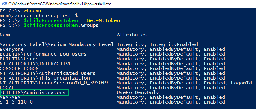 To discover what had changed, we began analyzing the token for the medium-integrity child process, comparing it to our previous findings. We noticed certain group memberships had been removed. Notably, the BUILTINAdministrators group membership was missing.