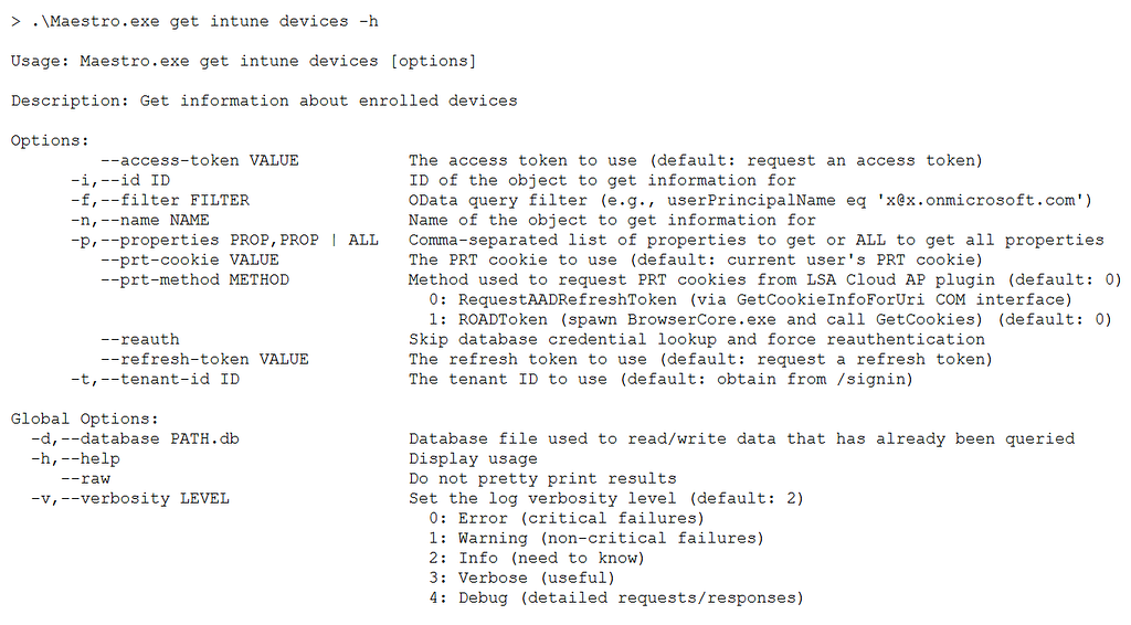 .\Maestro.exe -d <name>.db get intune devices -f “userPrincipalName eq ‘<user>@<tenant>.onmicrosoft.com'” -p usersLoggedOn