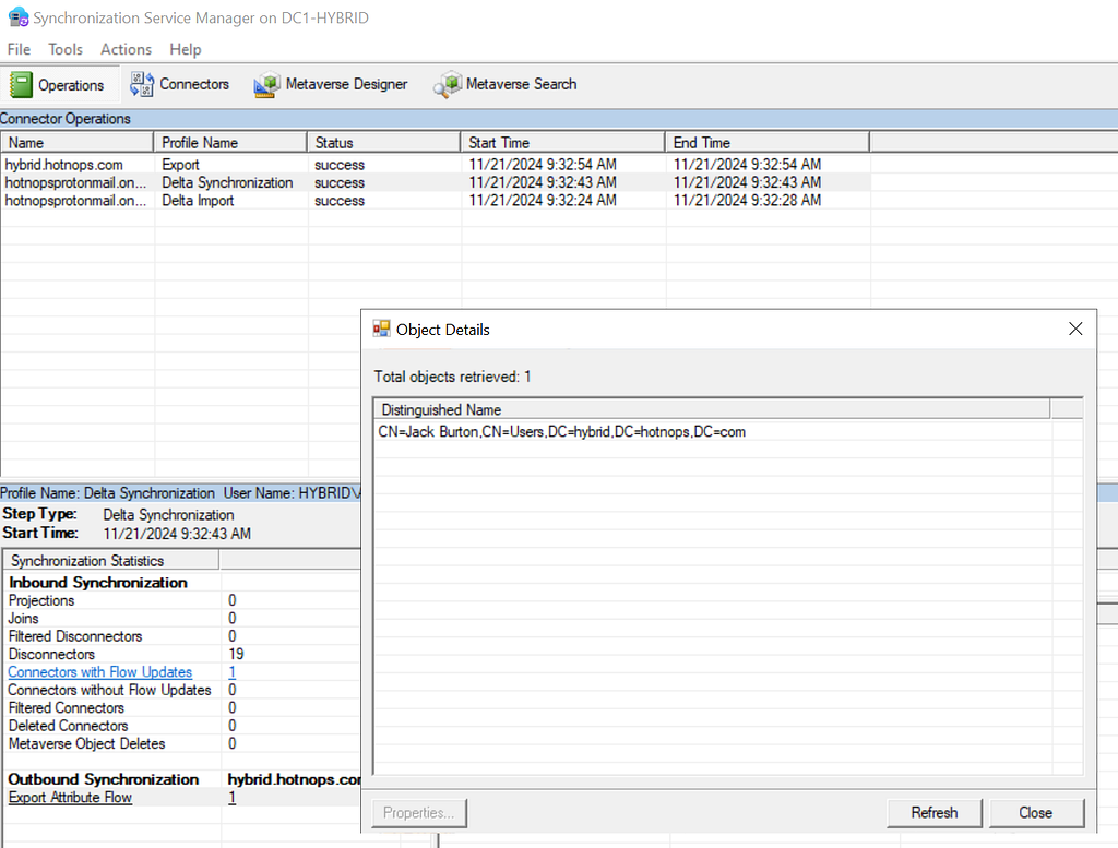 Don’t worry about the export errors, I have been doing stuff. At this point, we have an end to end flow of an object being created in AD, projected into the metaverse, and then provisioned in Entra. But from the Entra Connect standpoint, there’s no special differentiator between Entra and Active Directory, they are both simply connector spaces.