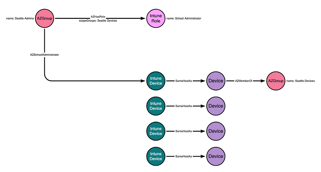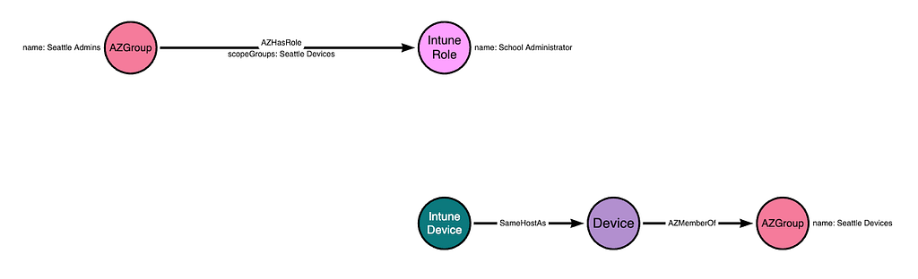 We can connect the Entra and Intune device nodes with an edge indicating they are the same host. This reveals the full pattern connecting the Intune device to the Entra user: