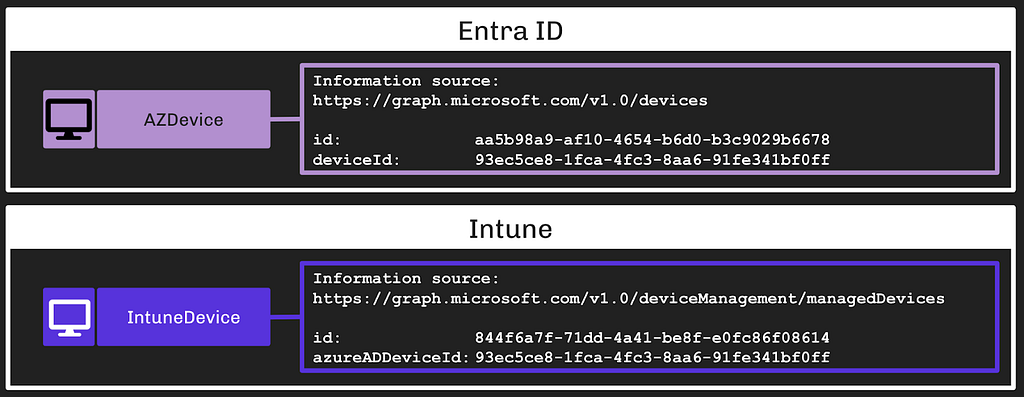 Because of this, Intune Devices are distinct objects from Entra Devices. They are accessed and managed with a distinct API and they have universally unique identifiers that are distinct from Entra Devices: