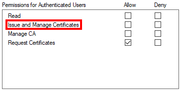 Even though we refer to the role as Manage Certificates, in the security tab of the CA, it is actually called Issue and Manage Certificates.