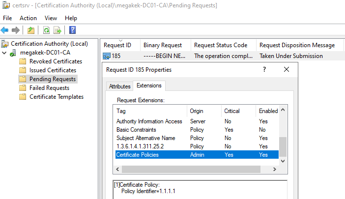 This effectively shows that the Manage Certificates role is able to modify certificate template extensions as long as there is no default extension defined for the template in question. While I could only come up with the issuance policy scenario, I am sure that there are more extensions that I’ve overlooked, so there might be even more ways to abuse this.