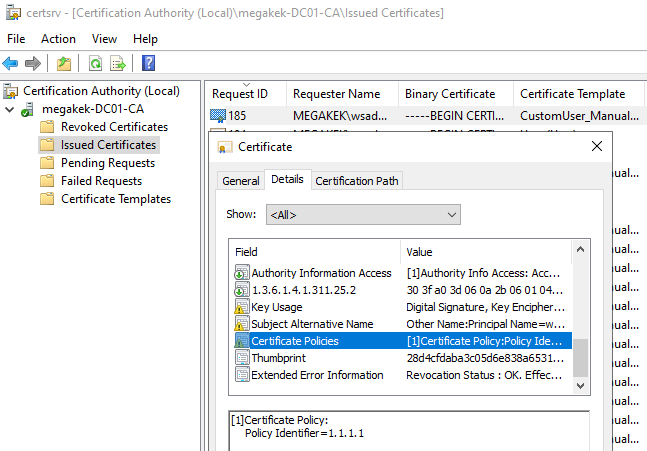 I tried to append an issuance policy with OID “1.1.1.1” to the certificate template, and while I did not expect it to remain when issuing the certificate, against all odds, it did!