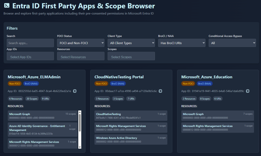 Additionally, Dirk-jan Mollema and Fabian Bader recently released entrascopes where more information about applications and permissions are in a searchable format. The project lays out detailed information about applications in the Entra and Azure ecosystem. Filters allow you to search for BroCI applications and get information about the scopes, redirect URIs and more.
