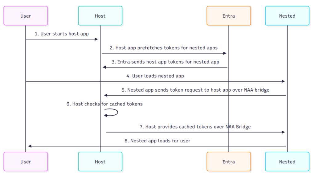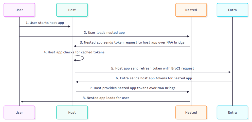 , to indicate it is a brokered request. The token is issued to the host application and sent back to the nested application to store and use. From the user perspective, the NAA flow is seamless and they are not prompted for authentication.