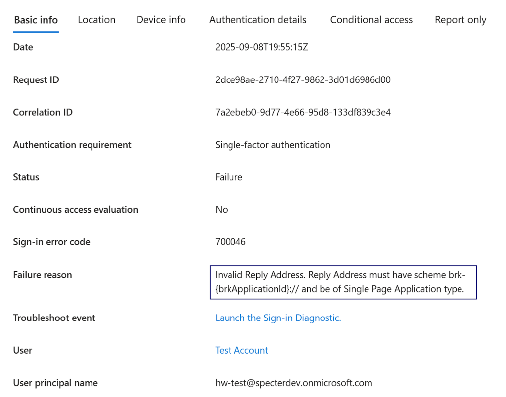 Digging into some of the errors can also reveal mistakes when making BroCI token requests. Below is an example of a failed request where the reply address did not match the broker client that Entra has configured for that application.