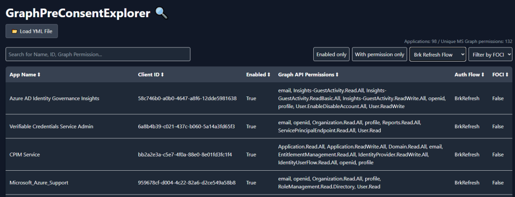 This is cool and all, but how does an attacker know what applications can be brokered? Remember how I said researchers were looking into this for a while now? Luckily, these awesome researchers have released resources that can help. From zh54321 there is GraphPreConsentExplorer. This repository contains a web GUI that loads a YAML file with information about applications and copyable commands to use with EntraTokenAid.