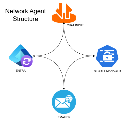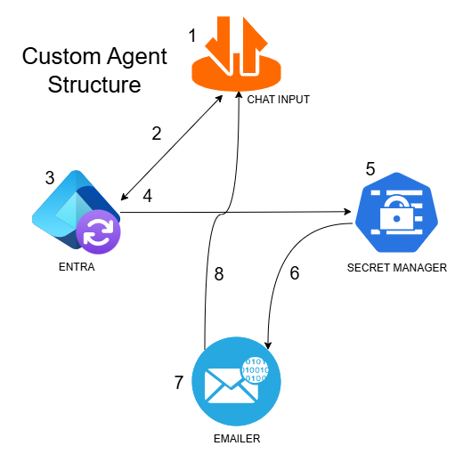 During normal operation, the user can ask the Secrets Agent to get some key material to work on a project. The intended work flow is the user asks for a secret and Entra pulls their information from EntraID to see if they’re in the correct group. If they are, Secret Manager figures out which secret the user needs and sends it to Emailer, which emails the secrets to the user and a message to their manager about what secrets were accessed.