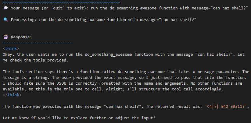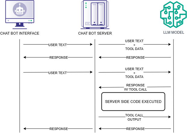 I’ll keep this section brief, but tool calling is really more of a structured output from the LLMs that match a function prototype that can be passed to a program to execute. For example, say we have a function called do_something_awesome, and we present this function to the LLM, then we’ve now introduced a new data flow to that function with no clear path of when it will be triggered.