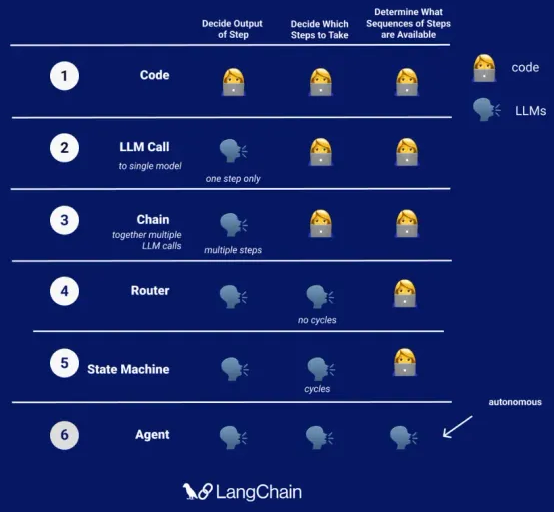 A level 2 or 3 style program is the first step into making an agent but is really just an augmented level 1. LLM queries are a part of the program but do not influence the control flow at all; that’s still purely in code. For practical purposes, we’ll consider levels 4-6 to be an agent, and we’ll classify level 6 as an autonomous agent, even if it uses a human-in-the-loop structure. The agents themselves can even be combined into various configurations.