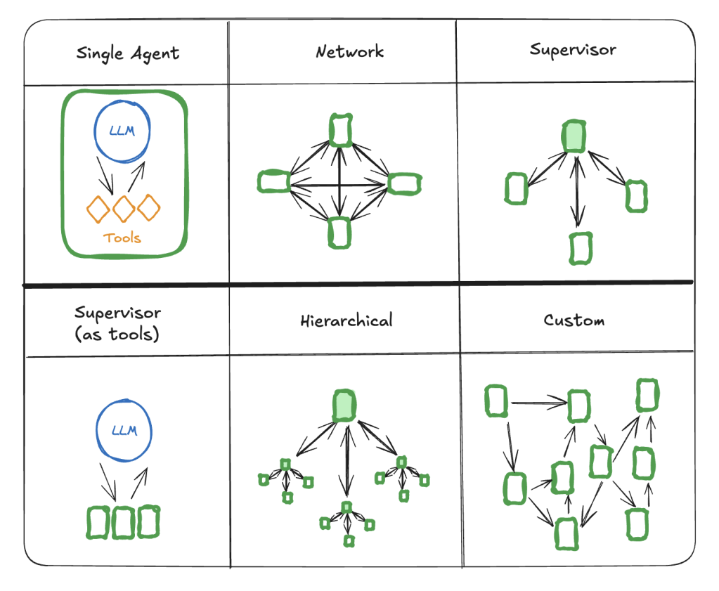 A single agent structure is what most people are familiar with when running agents on their local hardware, but combinations can largely be condensed into these forms, with custom being the primary one production systems tend toward. For example, say we have a supervisor model, then we have one agent for managing a team of agents, and then agents with a specialized focus that the supervisor can pass execution to for handling a task.