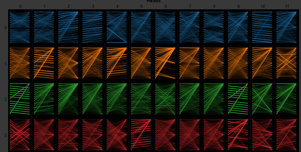 The following screenshot shows just a handful of the layers from the BertViz example notebook. This is 12 attention heads processing just the first four layers of that model. This is just a wee baby compared to a model like GPT-OSS-20B with 64 heads and 24 layers. (Quick aside, the B value is for billion; that’s how many floating points or weights the model uses.)