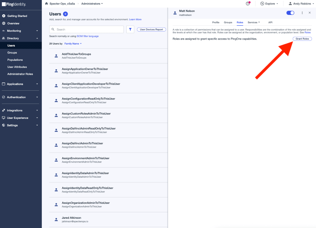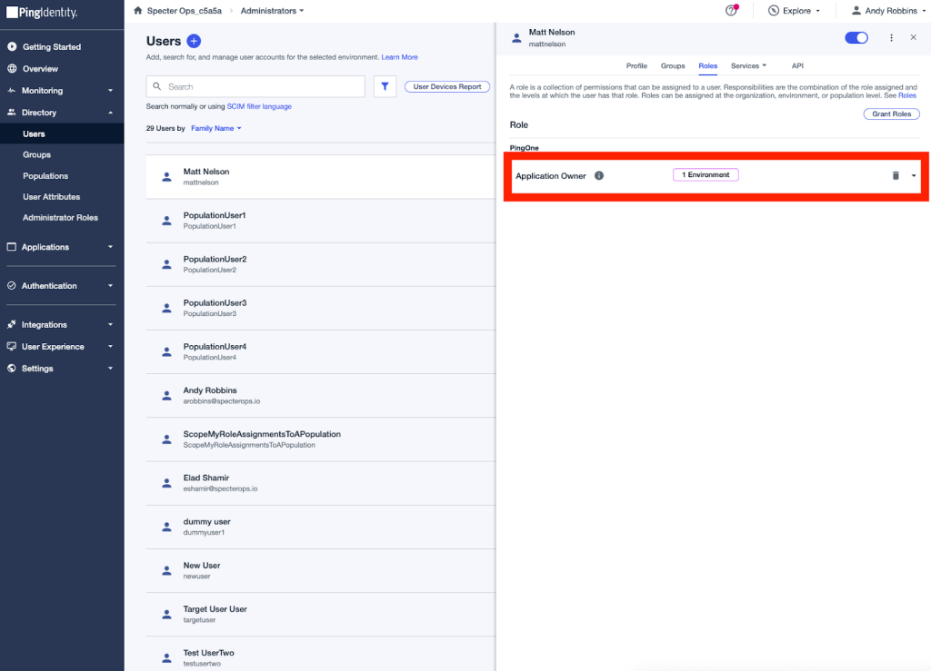It is within an environment where you will find users, groups, roles, applications, and all the other objects for which we’ve developed tradecraft for. In this way, you can think of a PingOne environment being somewhat analogous to an Entra ID tenant.