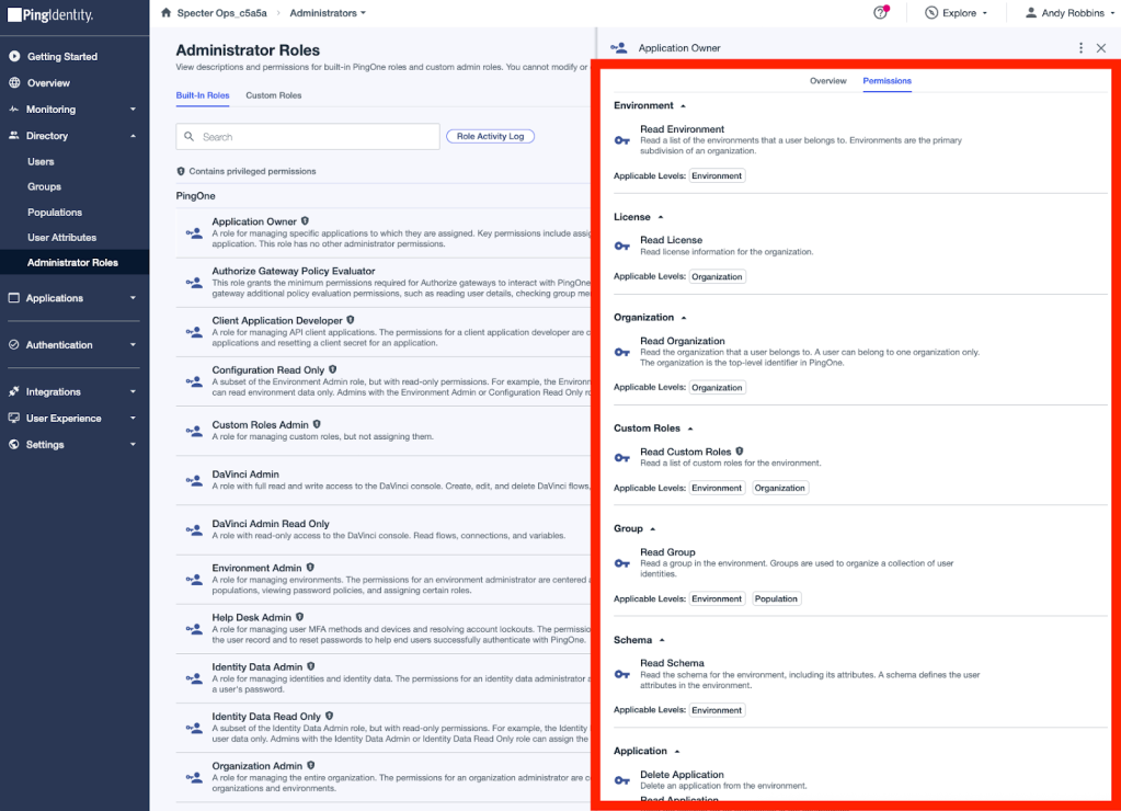 Roles in PingOne list the permissions defined in that role. For example, we can observe the “Permissions” tab for the “Application Owner” role in a PingOne Environment to see the permissions defined by that role: