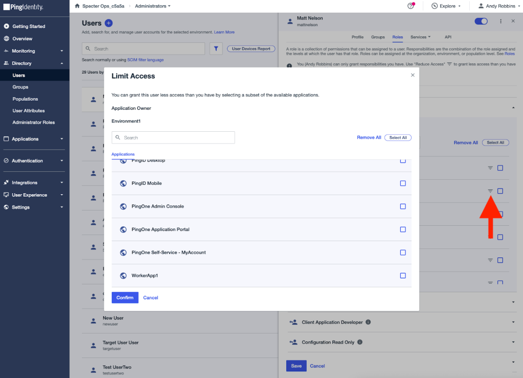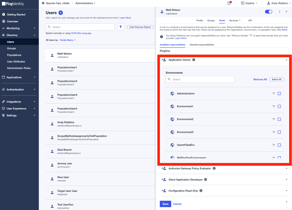 Now let’s grant the first user a role assignment, scoped to Population2. We will say we are granting the user the “Environment Admin” role, which allows for force updating a user’s password: