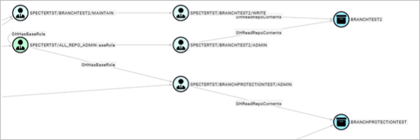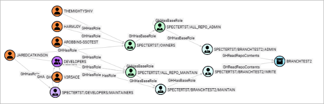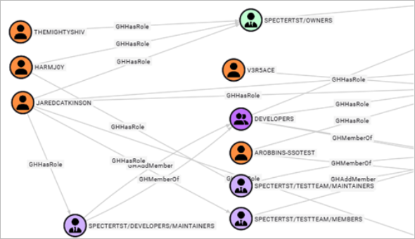 The resulting graph is a bit large for a screenshot, but we can see five users have access to a couple of repos. This may seem trivial, but like AD groups, GitHub teams and roles quickly become nested and determining who has read access to a repository may not be clear. In a large collection, this graph would likely be even bigger and messier. So, starting with a query for groups containing the word “dev” or “ci-cd” may prove more useful.
