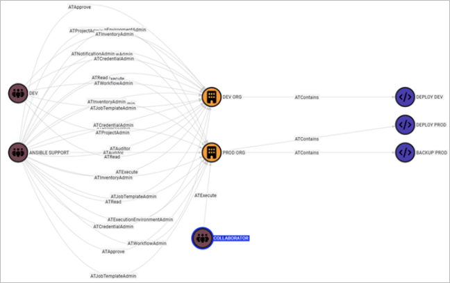 Though access may be limited to a containerized build, there’s potential for discovering additional credentials, moving laterally between machines, and container escapes. Using the example data from the AnsibleHound repo, we can see the users in both Dev and Ansible support have the ability to execute and modify templates due to their admin status.