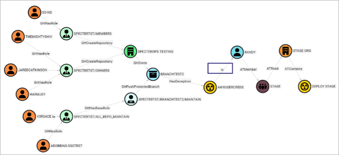 In our examples, we have AWX credentials exposed in GitHub. So, let’s say the AWX credentials are for the Randy user we created for Ansible. Therefore, a compromise of the AWX credentials would create an attack path that hops from GitHub to Ansible; by gluing our two graphs together, we can visualize this.