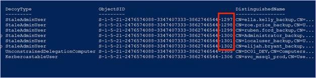 Something to note when deploying the cloned account deception solutions, the decoys are incrementing the RIDs generated by 1. From an attacker’s point of view, these may stand out as strange; as these accounts were supposed to be stale and old, yet the RID is newer (Shoutout to JD Crandell for noticing this).