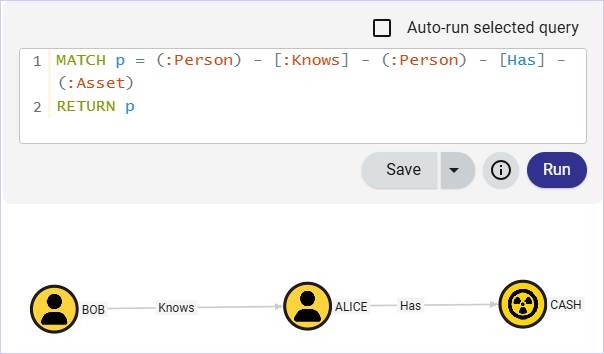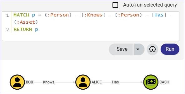 MATCH p = (:Person) - [:Knows] - (:Person) - [Has] - (:Asset)