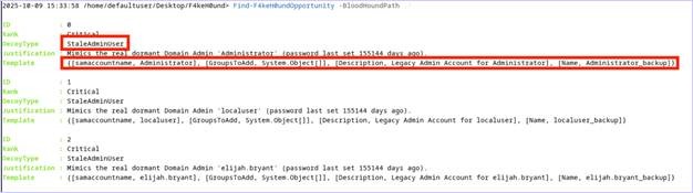 An alternative to creating new objects may be to use F4keh0und to identify existing objects providing the opportunity to turn them into a decoy. Old accounts from resigned employees are a great example; we can turn these accounts into deceptions by making some modifications to make them enticing from an abuse point of view while retaining their realism. This method of converting older or known stale accounts into deception solutions is a classic tradecraft method called “recycling” Active Directory objects.