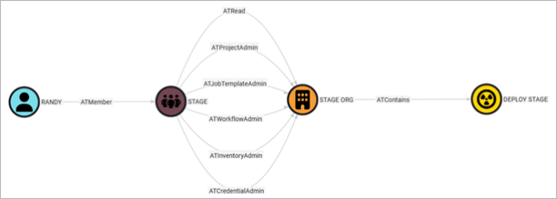 Then, we can add the DEPLOY STAGE job template to the STAGE ORG. Utilizing a cypher query, we can see the newly visualized attack path from the deception user RANDY to the deception job template.