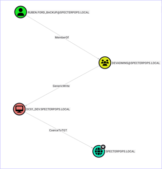 Defenders will likely have to create an attack path with the canary accounts as they do not automatically deploy with privileges to be revealed by attack path enumeration. In the below example, we added the canary backup accounts to a group with GenericWrite over the canary DC, DC01_DEV.