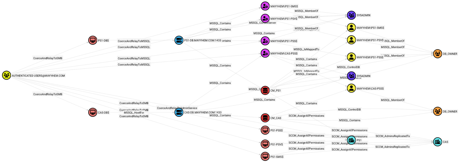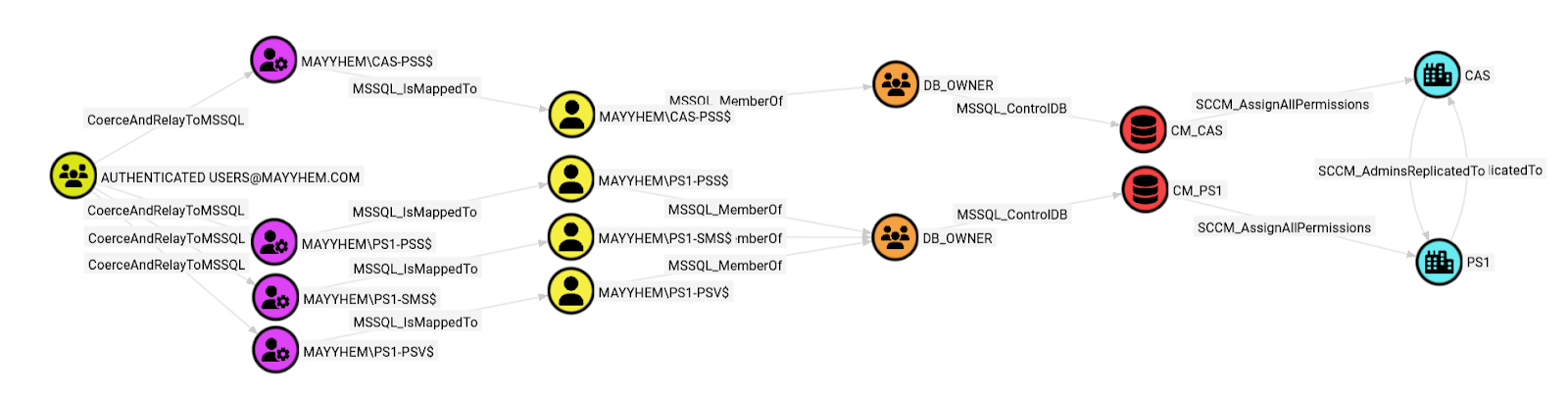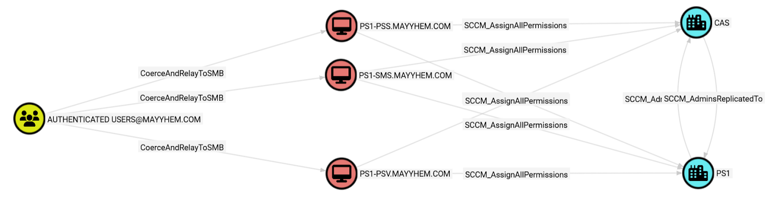 In this example, we can see that there’s a three-tiered SCCM hierarchy in the environment where we ran ConfigManBearPig, where CAS is the top-level central administration site, PS1 is a child primary site under CAS, and SEC is a secondary site under PS1. Note that the SCCM_AdminsReplicatedTo edge is drawn bidirectionally between primary and central administration sites but only toward secondary sites, because control of a secondary site does not allow hierarchy takeover like control of a primary or central administration site does.