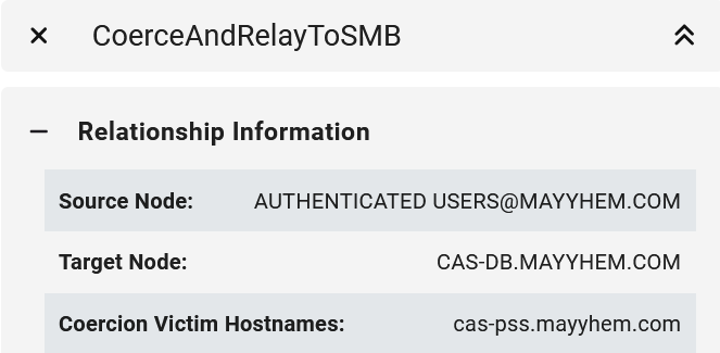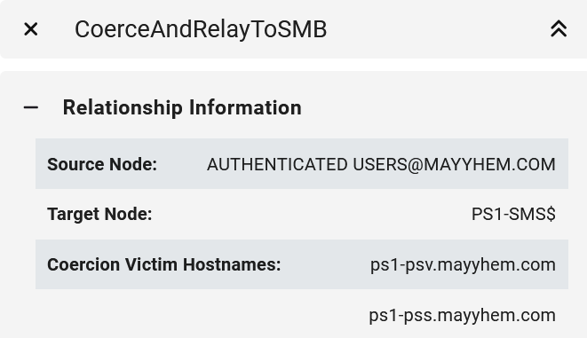We can open the entity panel for either CoerceAndRelayToSMB edge to display the site server to coerce from for each relay target.