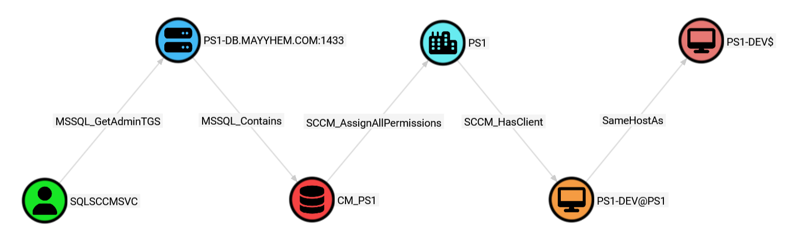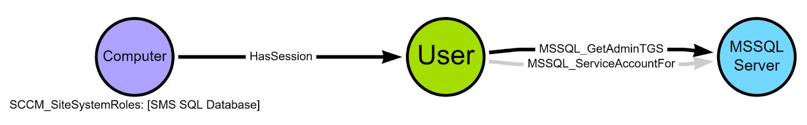 The MSSQL_GetAdminTGS edge indicates that if any domain principal is a member of the sysadmin role on the MSSQL server, the underlying service account can request service tickets for that principal to the MSSQL instance, allowing full control of the MSSQL_Server node. Since we know that the primary site server’s domain computer account is required to be a member of this role, we can create this edge.