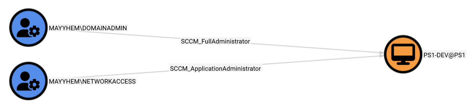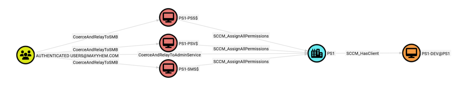 We can also identify specific attack paths through SCCM to our objective that resides on the PS1-DEV SCCM client device.
