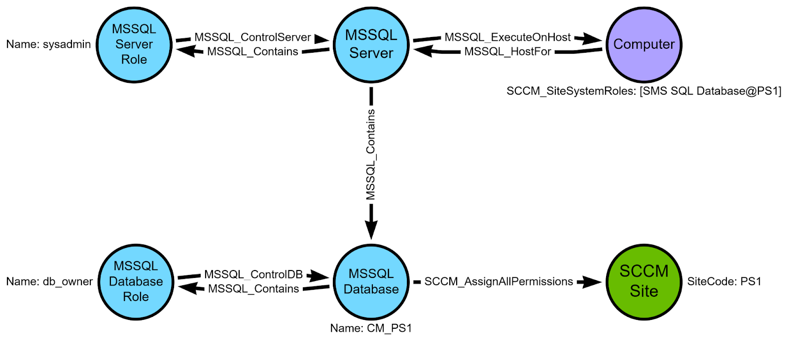 MSSQL_Server: the instance of MSSQL Server on the site database serverMSSQL_Database: the site database, the name of which is inferred from the three character site code (e.g.,CM_PS1)MSSQL_ServerRole: thesysadminfixed server role that exists on all MSSQL instancesMSSQL_DatabaseRole: thedb_ownerfixed database role that exists in all MSSQL databases