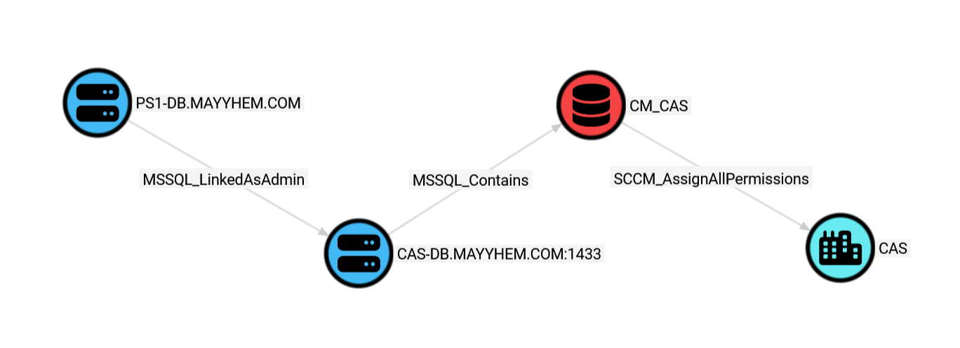 Here, we can see that the PS1-DB MSSQL server is linked with a sysadmin account to the CAS-DB MSSQL server that hosts the site database for the CAS SCCM site.