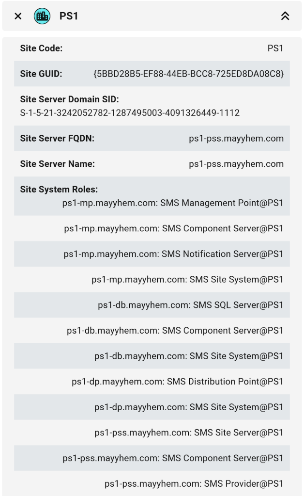 Next, click on any SCCM_Site node to bring up its entity panel, which includes a lot of useful information, including the three-character site code, primary site server, site database server, and other devices hosting site system roles for that site: